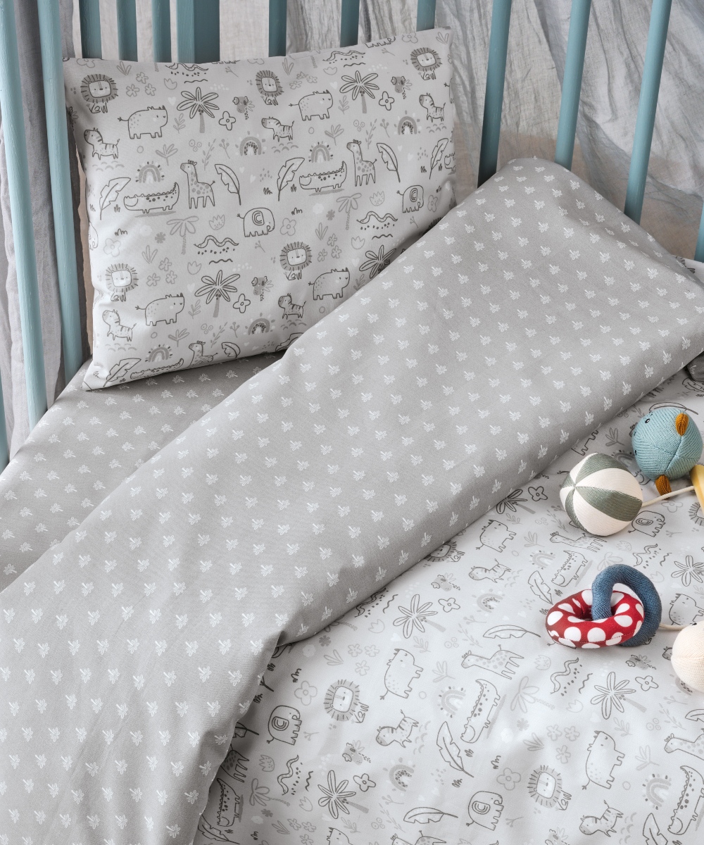 Σετ 2 τεμαχίων παπλωματοθήκη κούνιας (1 παπλωματοθήκη και 1 μαξιλαροθήκη), κατασκευασμένα με ύφασμα από 100% βαμβακερά νήματα πυκνότητας 150 κλωστών (150 TC), ανθεκτικά στην καθημερινή χρήση και στις συχνές πλύσεις, υποαλλεργικά, μαλακά στην αφή και με απαλή αίσθηση για το δέρμα του μωρού. Ενδείκνυται Πλύσιμο στους 40°C.