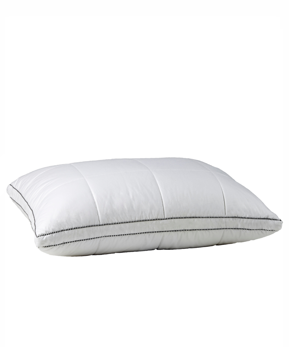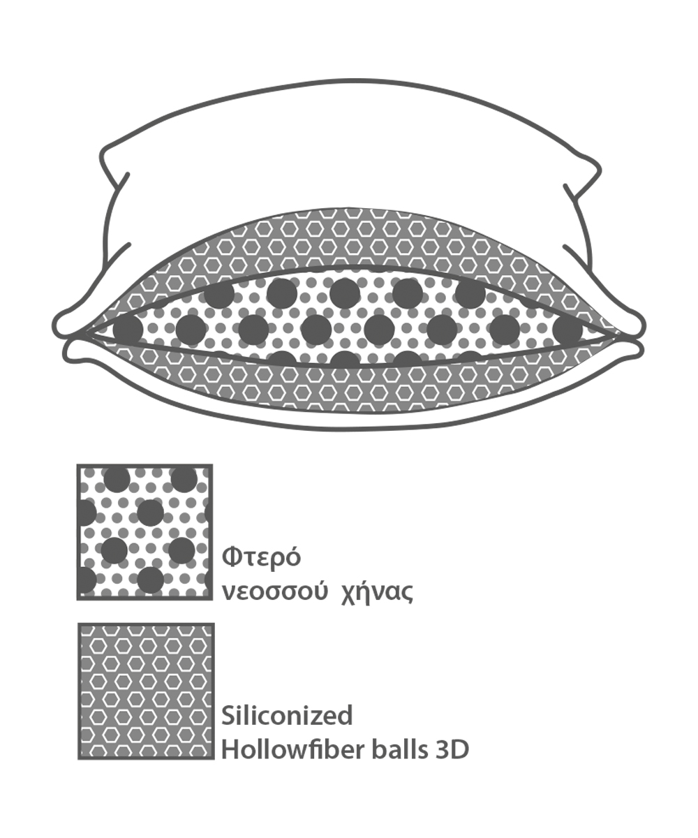Ανατοµικό τρισδιάστατο μέτριας σκληρότητας πουπουλένιο µαξιλάρι µε περιµετρική ραφή από φίνο βαμβακερό ύφασμα περκάλι.Το µαξιλάρι goose είναι µία κατασκευαστική καινοτοµία αφού αποτελείται από 2 µαξιλάρια, ένα εσωτερικό µε γέµισµα 50% λευκό φτερό νεοσού πάπιας (duck feather) και 50% από siliconized hollowfiber balls 3D 800γρ και ένα εξωτερικό (σε κάθε πλευρά) από υποαλεργικό υλικό μικροϊνών 3D hollowfiber 120γρ/πλευρά.