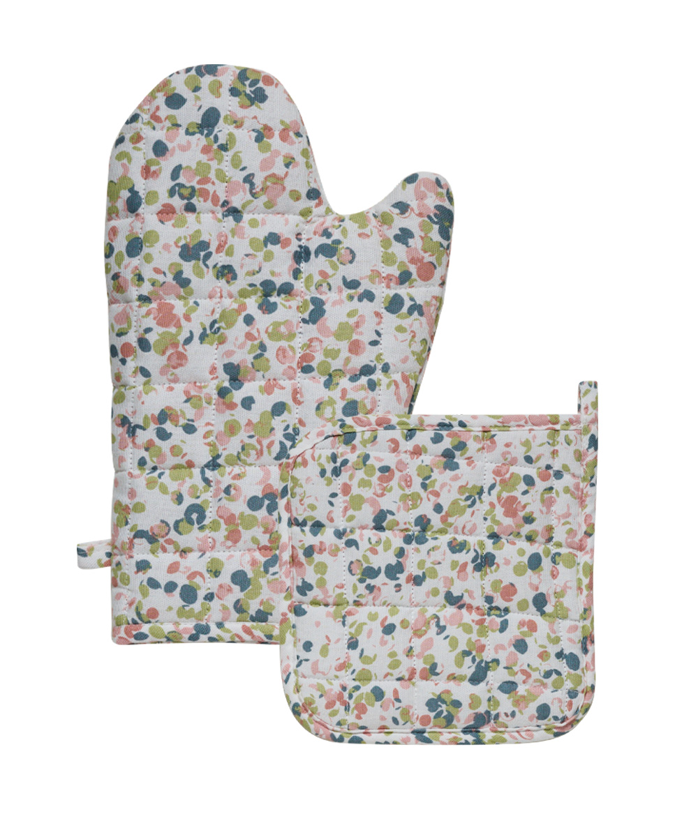 Σετ 2 τεμαχίων γάντι και πιάστρα κατασκευασμένα από 100% βαμβακερό ύφασμα υψηλής ποιότητας 160gr/m². Η φυσική σύνθεση του βαμβακιού προσφέρει ανθεκτικότητα και ευχάριστη αίσθηση στην αφή καθιστώντας τα ιδανικά για καθημερινή χρήση στην κουζίνα. Σχεδιασμένα για ασφαλές κράτημα ζεστών σκευών, βοηθούν στην προστασία των χεριών κατά τη μεταφορά, αποτελούν απαραίτητο αξεσουάρ για κάθε κουζίνα συνδυάζοντας ασφάλεια και αισθητική. Ενδείκνυται πλύσιμο στους 40°C.