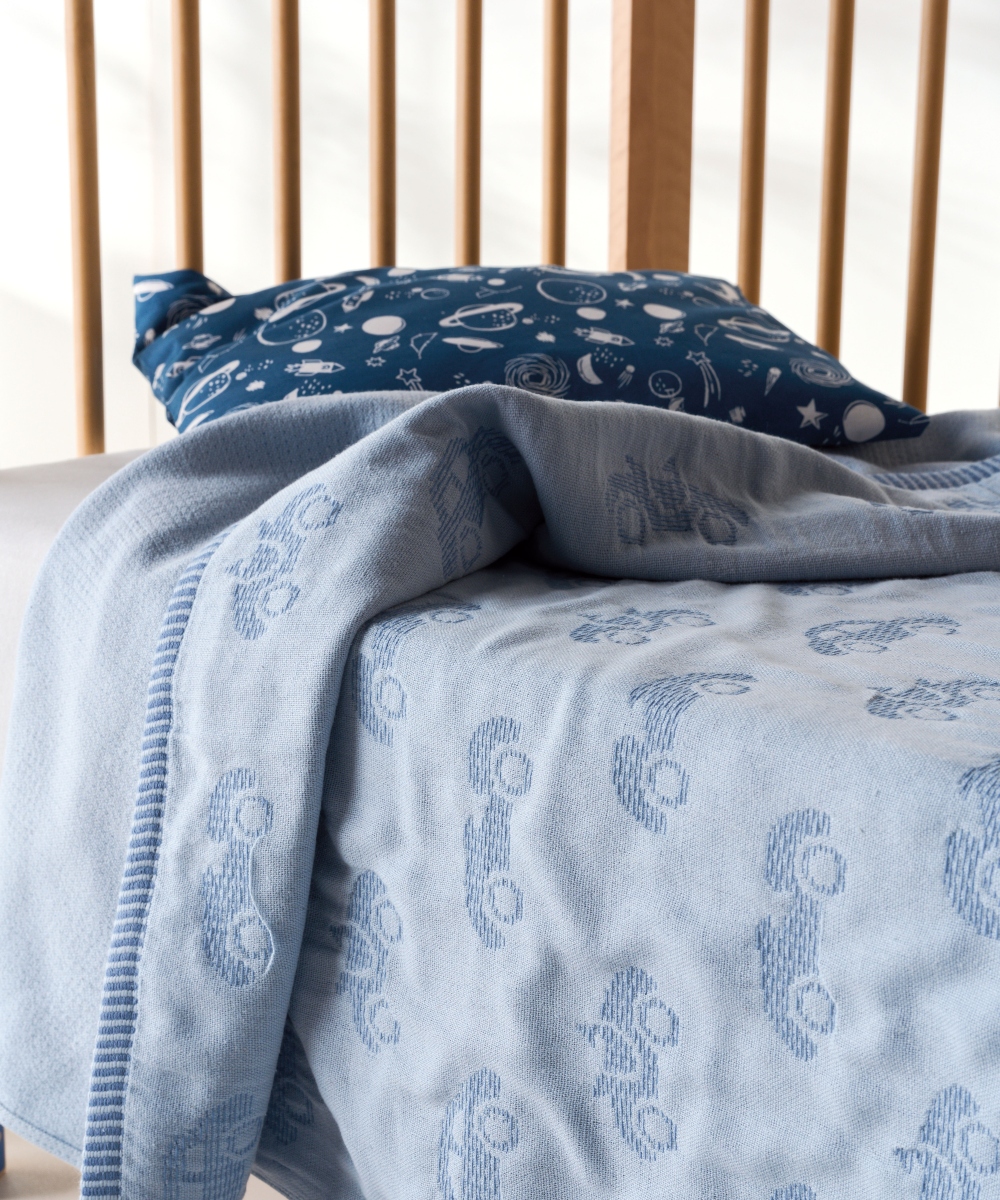 Βαμβακερή ματλασέ βρεφική κουβέρτα με ιδιαίτερα απαλή και αφράτη αίσθηση. Το ματλασέ είναι ύφασμα που δημιουργείται με την τεχνολογία πλοκής διπλών υφασμάτων που τα νήματα πλέκονται και σχηματίζουν ένα πικέ ανάγλυφο σχέδιο. Το ματλασέ φαίνεται σαν να έχει εσωτερική επένδυση, στην πραγματικότητα όμως αυτό είναι μια ψευδαίσθηση που δημιουργεί η ιδιαίτερη αυτή ύφανση. Ενδείκνυται Πλύσιμο στους 40°C.