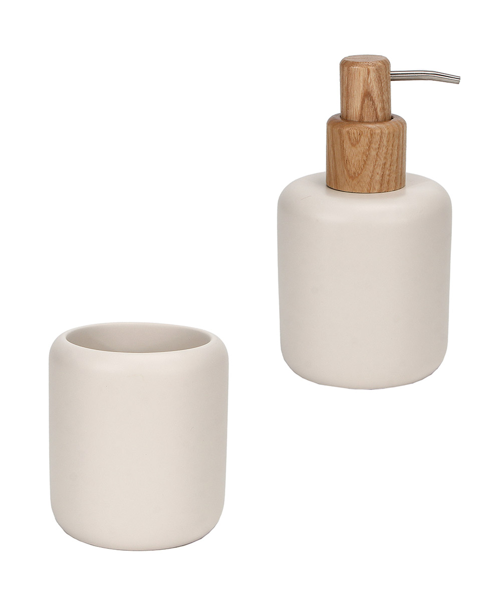 Σετ μπάνιου 2 τεμαχίων, που περιλαμβάνει ποτήρι και αντλία σαπουνιού. Κομψό και λειτουργικό, χαρίζει οργάνωση και στυλ στον χώρο του μπάνιου, ιδανικό για καθημερινή χρήση ή ως διακοσμητικό στοιχείο στον νιπτήρα.