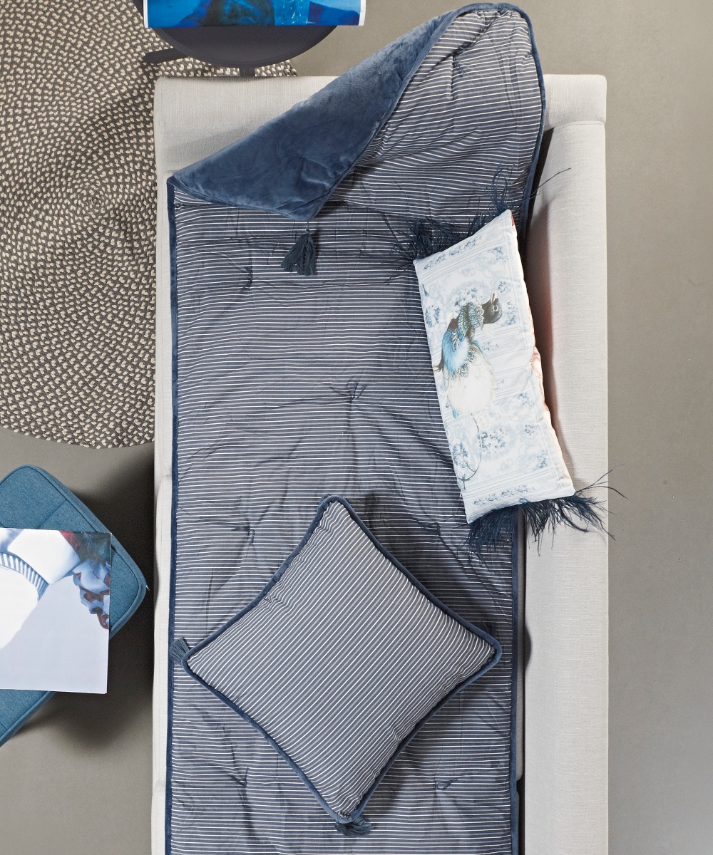 Διακοσμητικό μαξιλάρι με γέμισμα, διπλής όψης που από την μια όψη έχουμε μονόχρωμο βελουτέ ύφασμα από την άλλη ριγέ σχέδιο. Είναι στολισμένο με φούντες στις 4 γωνίες.