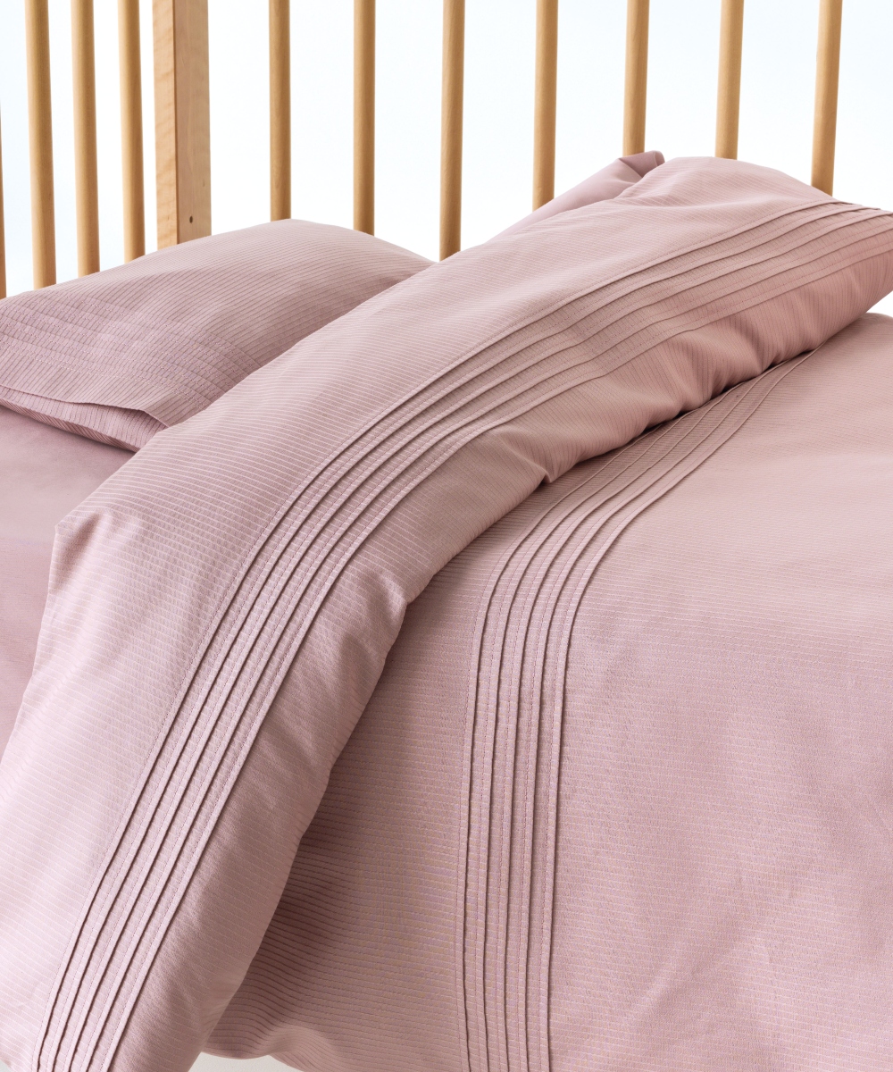 Βρεφική παπλωματοθήκη κούνιας με πιέτα σετ 2 τεμαχίων, κατασκευασμένη από 100% βαμβάκι σατέν 300 TC. Το υψηλής ποιότητας βαμβάκι σατέν χαρίζει απαλή, μεταξένια υφή και φυσική απαλότητα στο δέρμα του μωρού και η πιέτα προσθέτει κομψότητα και στιλιστική λεπτομέρεια. Ιδανική για ανανέωση της βρεφικής κρεβατοκάμαρας με άνεση και στυλ. Ενδείκνυται πλύσιμο στους 40°C.