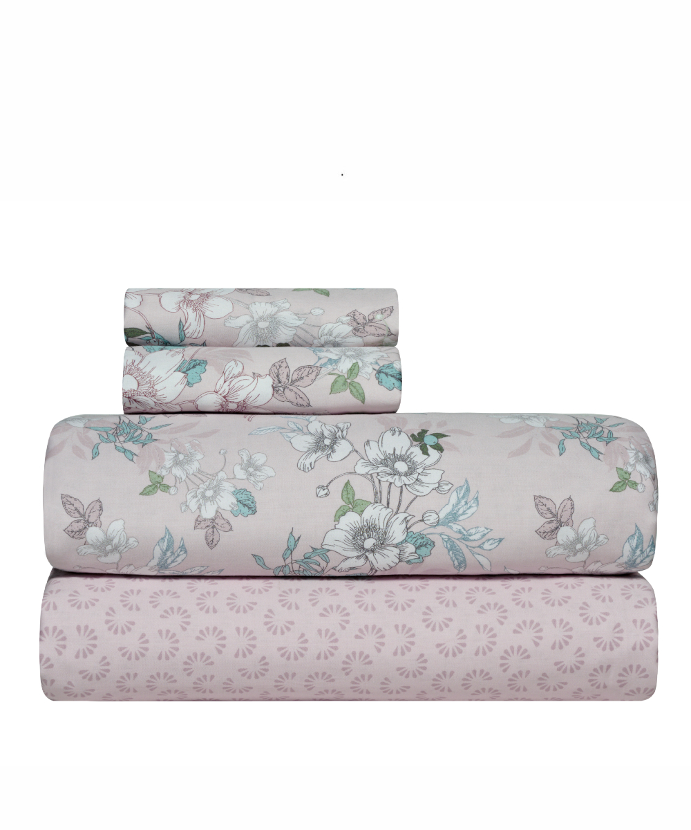 Queen size sheets set 4 pieces (top sheet, bottom sheet and 2 pillowcases) made from 100% cotton sateen fabric, 210 thread count (210TC). It features a smooth finish, a soft feel and exceptional durability, maintaining its fresh, like-new feel even after many washes. Recommended washing at 40°C.