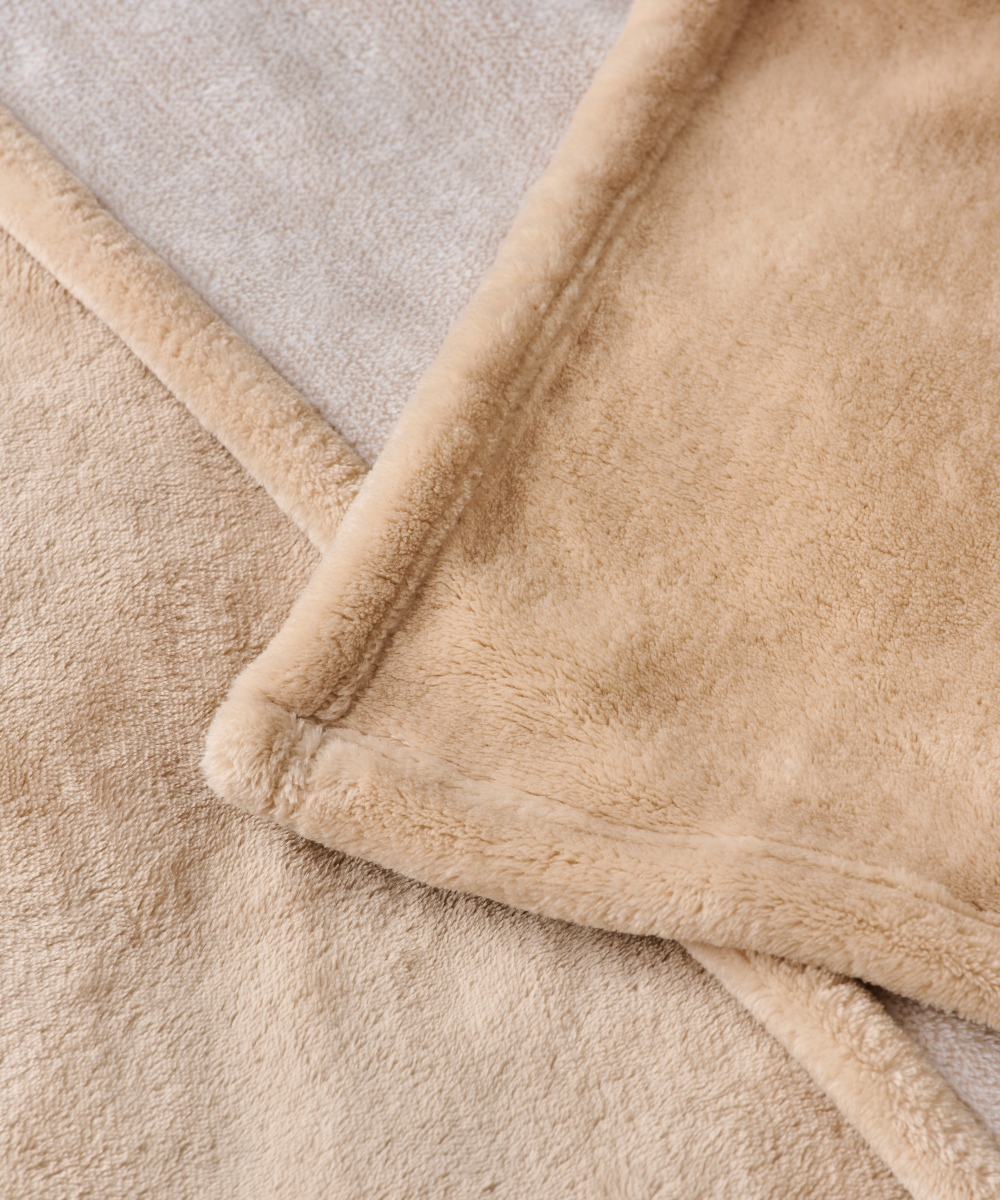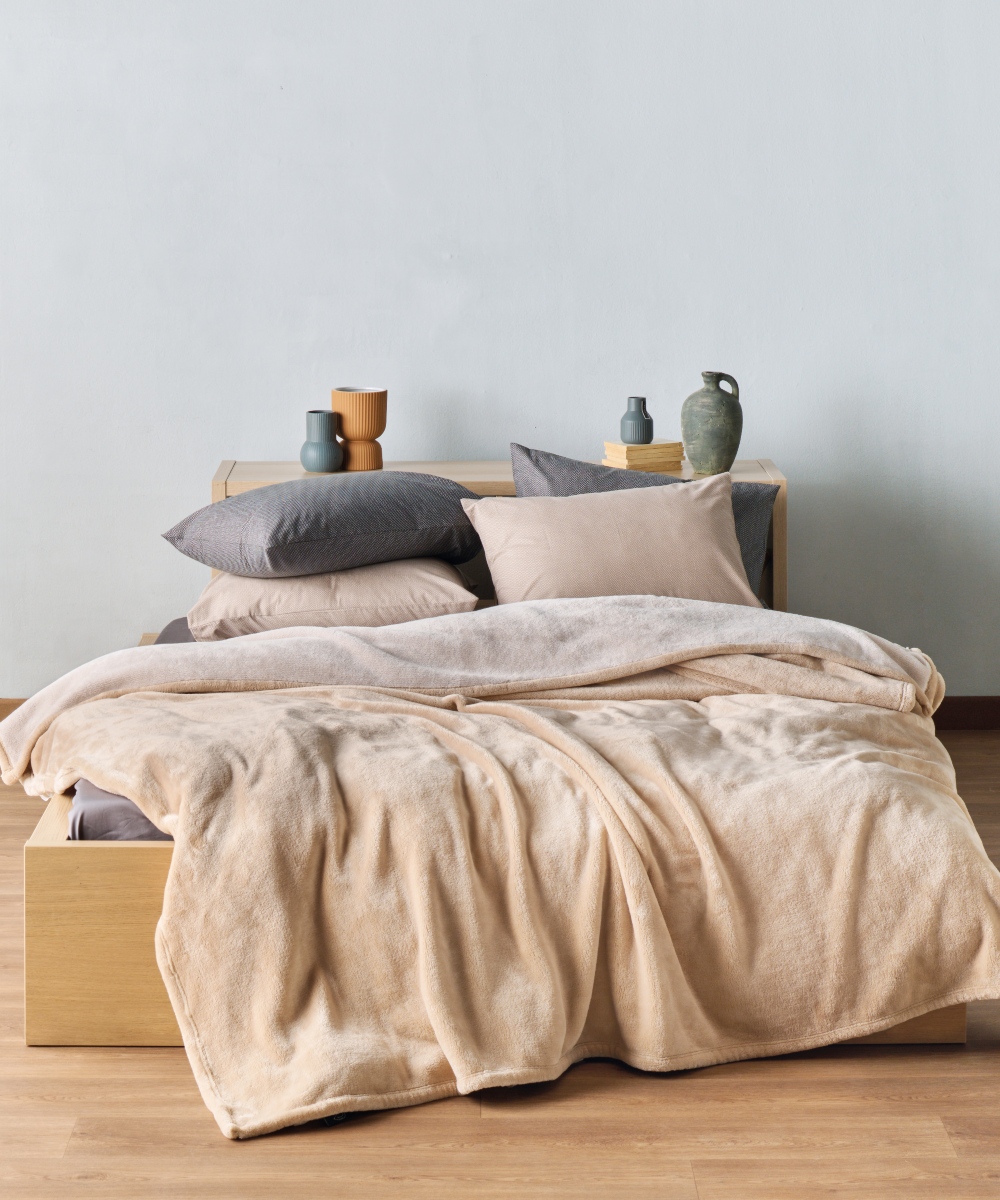 Κουβέρτα Flannel Fleece διπλής όψης. Από τη μία πλευρά διαθέτει μονόχρωμο φινίρισμα με βελούδινη υφή, ενώ από την άλλη πλευρά είναι δίχρωμη προσφέροντας κομψή αντίθεση για να αλλάζετε στιλ ανάλογα με τη διάθεσή σας. Η κουβέρτα είναι εξαιρετικά απαλή, ανάλαφρη και ζεστή, ιδανική για τις κρύες νύχτες του χειμώνα ή για στιγμές χαλάρωσης στον καναπέ.